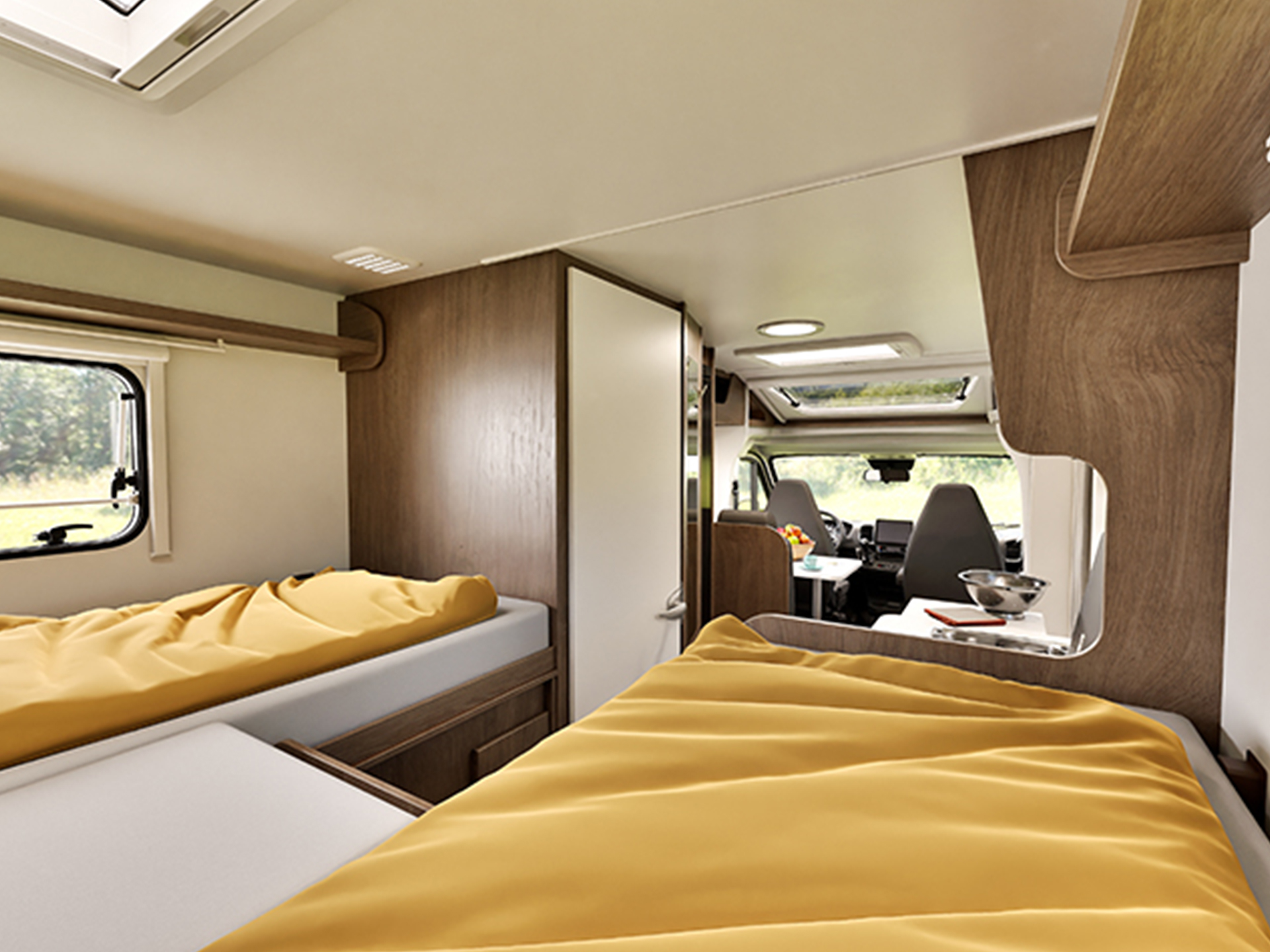 - Podélná samostatná lůžka v zadní části s volitelným spojovacím prvkem pro vytvoření manželské postele